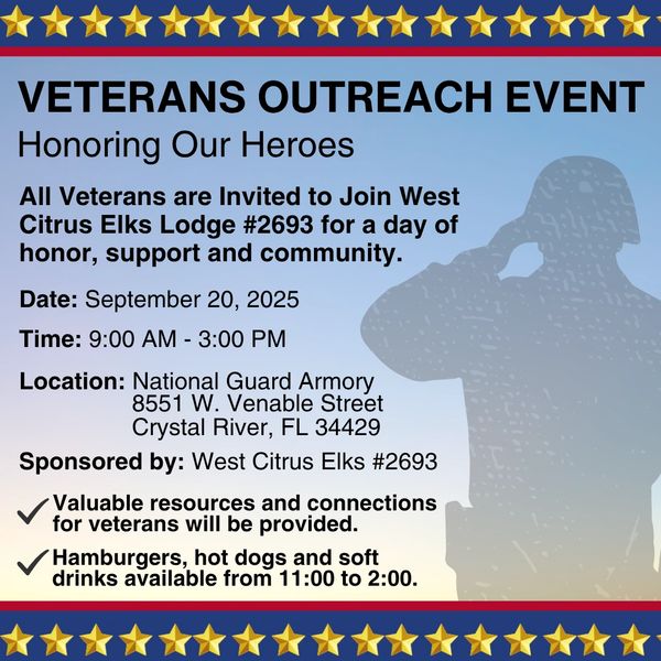 Join West Citrus Elks Lodge 2693 for a Special Veterans Outreach Event and Suicide Awareness Walk-a-Thon.